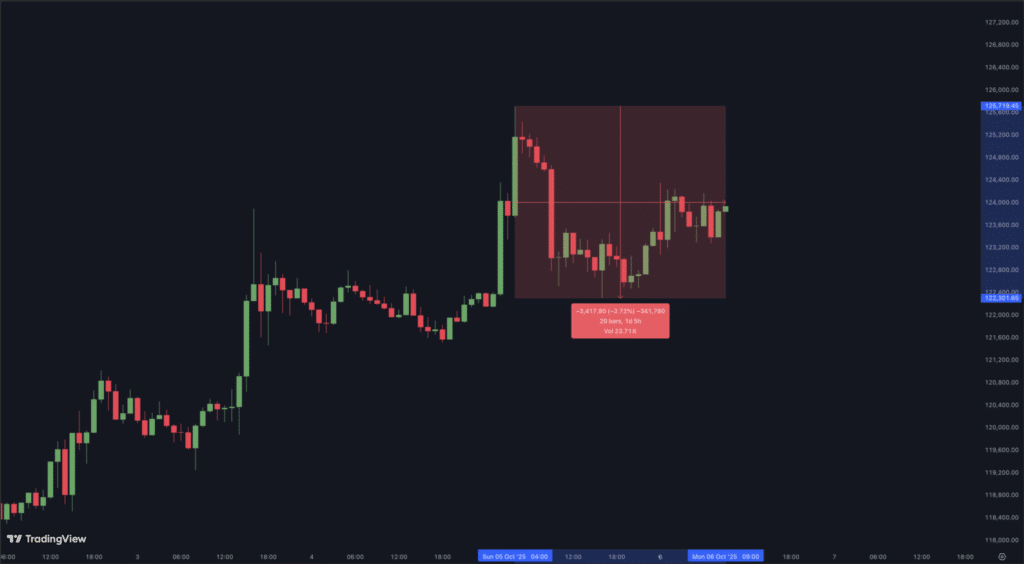Прошедшая неделя принесла биткоину серию впечатляющих результатов. Цена превысила 125 000 долларов СШАпосле чего рынок решил остановиться. Данные TradingView показывают, что BTC упал примерно на 1,5-2% сразу после рекордного максимума.
