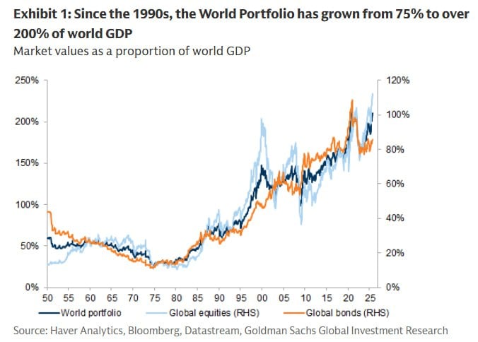 Мировые инвестиционные активы достигли 261 триллиона долларов, что составляет примерно 200% мирового ВВП и четверть того, что было в 1990-х годах. Об этом говорится в новом обзоре Goldman Sachs, пишет Hugs.fund.