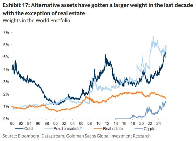 Рост альтернатив: частные рынки, золото и криптовалюты увеличили вес по сравнению с публичными рынками, хотя они по-прежнему остаются относительно небольшим сегментом.