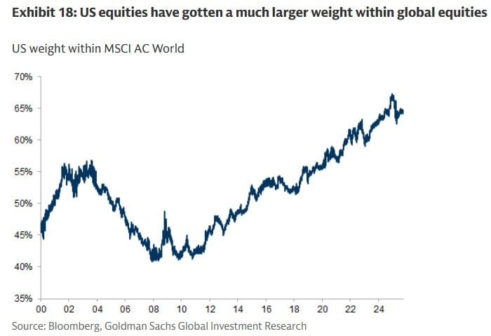 Доминирование США: Активы США – как акции, так и облигации – значительно укрепили свои позиции и теперь доминируют в мировом портфеле.