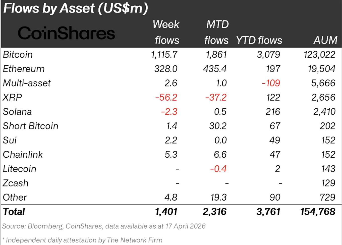 Криптовалютный рынок показывает мощное восстановление. За неделю с 13 по 17 апреля инвестиционные продукты на базе цифровых активов привлекли $1,4 млрд. Согласно отчету CoinShares, это лучший недельный показатель с января и третьей недели подряд. Общий объем активов в управлении (AUM) достиг отметки $155 млрд.