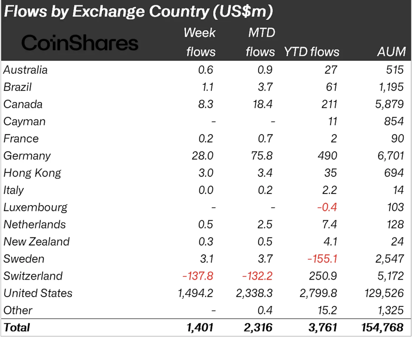 В региональном разрезе наибольший приток зафиксировали в США — $1,5 млрд. В Германии инвесторы вложили еще $28 млн. В то же время Швейцария стала исключением: там зафиксирован отток $138 млн — самый большой с ноября прошлого года.