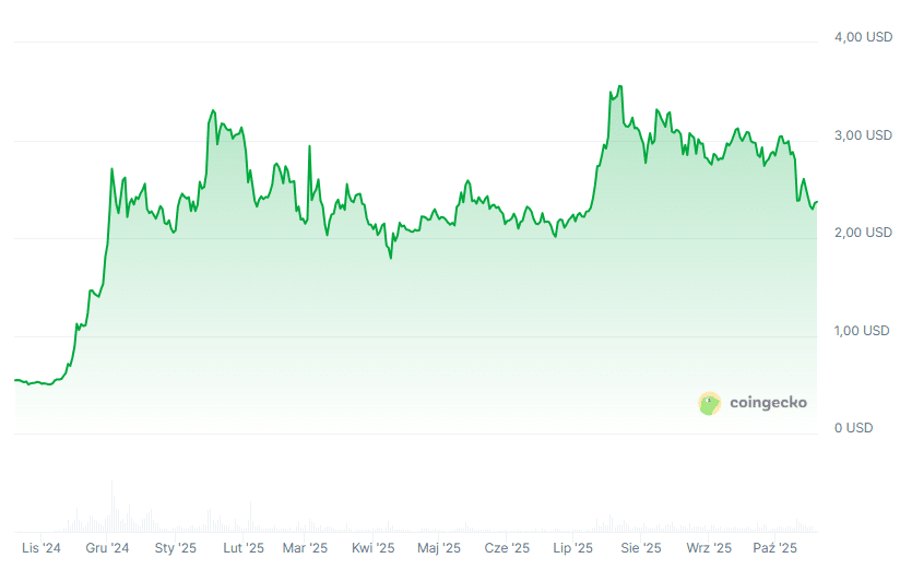 - Скользящие средние (MA): Цена торгуется ниже MA50 (около $2,50) и MA200 (около $2,60), что сигнализирует о краткосрочном нисходящем тренде. Прорыв $2,75-2,89 может указывать на бычье пересечение.