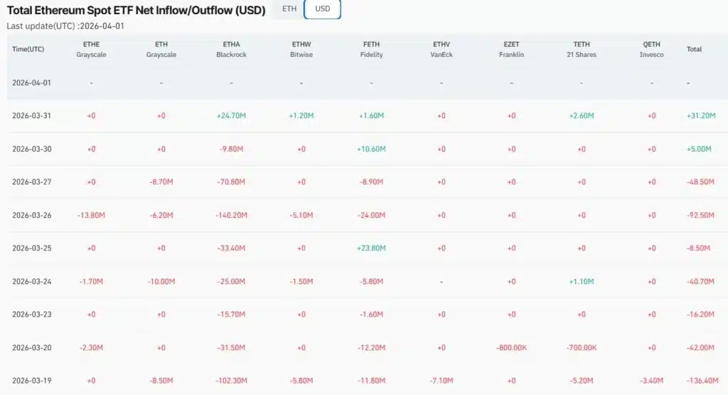 Катастрофическая серия была окончательно прервана только 30 марта. Тогда ETH ETF зафиксировал скромный приток в $5 млн. В течение следующего торгового дня ETH ETF также зафиксировали приток капитала, на этот раз гораздо больший (31,2 миллиона долларов США). Это сигнал о том, что институциональное отношение к Ethereum медленно меняется. В этом случае также нет гарантии отскока, но после долгой неблагоприятной серии происходит многообещающее движение, которое может предвещать восстановление рынка и отскок.