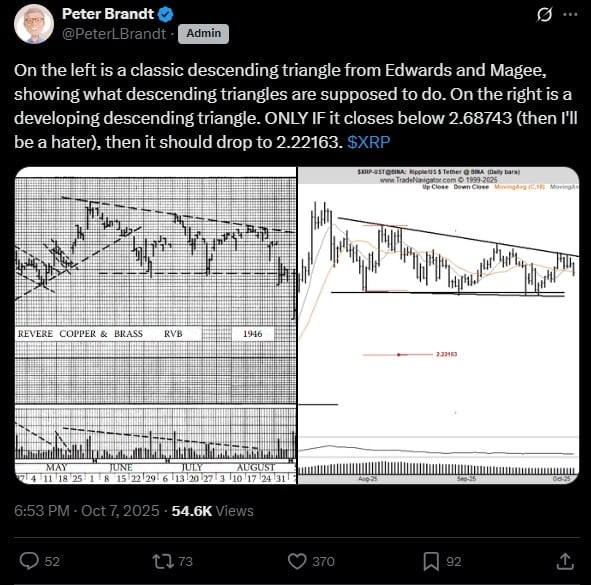 Начало происходить что-то тревожное, и может стать ещё хуже. Питер Брандт представил свой анализ XRP. В одном из своих недавних постов на X уважаемый эксперт представил сценарий, при котором цена Ripple упадет до 2,22 доллара США. По мнению эксперта, на графике криптовалюты формируется нисходящий треугольник, что сигнализирует об ослаблении восходящей тенденции. По оценкам Брандта, если эта формация разовьется и токен закроется ниже 2,68743 доллара США, его цена упадет до 2,22 доллара США.