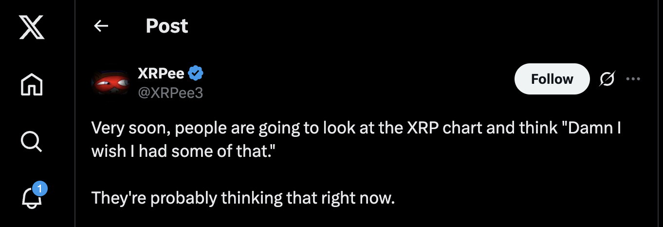 Персонаж из сообщества xrp «xrpee» считает, что критический момент близок. Это говорит о том, что люди скоро рассмотрит таблицу XRP и сожалеют, что они не отреагировали ранее. Это чувство является следствием добычи XRP до 3,66 доллара США, что является самым высоким уровнем от цикла роста 2018 года, сигнализируя о потенциальной новой эре для этих активов.