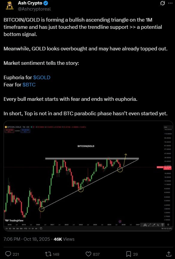 Crypto Ash в одной из последних записей на X представил анализ, который показывает, что пара Биткойн/золото формирует бычий восходящий треугольник на интервале 1М и только что коснулась поддержки линии тренда. Как отмечает эксперт, это потенциальный низкий сигнал.. Золото, по мнению Acrypto Ash, похоже, перекуплено и, возможно, уже достигло своего пика.