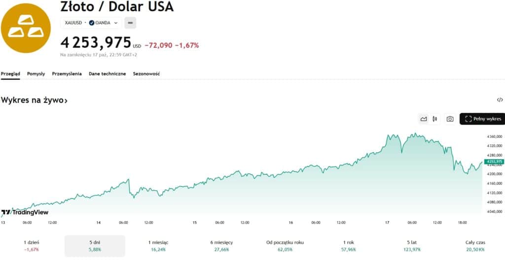 Металл достиг дальнейших рекордных цен. На момент написания золото торгуется на уровне $4253 и за последние 24 часа немного потеряло динамику, потеряв 1,67%. Однако за прошедшую неделю металл подорожал на 5,88%. В свою очередь, за весь последний месяц стоимость золота выросла на 16,24%. Однако с начала года золотая руда подорожала на 62,05%.