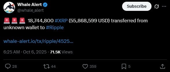 Рынок криптовалют явно восстановился после слабого конца сентября. Среди токенов, которые значительно улучшили его рейтинг, оказался XRP. Его держатели уже отсчитывают дни до вероятного запуска спотовых фондов, на которые они возлагают большие надежды. Однако в начале новой недели транзакция с токенами XRP на сумму около $55 млн вызвала беспокойство и спекуляции среди фанатов. Изначально все думали, что за этим движением стоит анонимный кит. Между тем, последняя подсказка указывает на то, что этот шаг был сделан Ripple. Что здесь происходит?