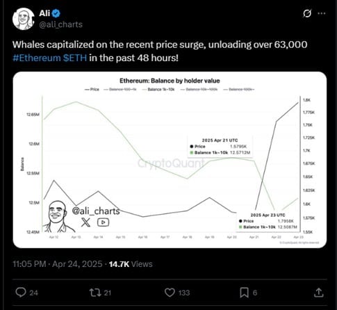 По словам Али Мартинеса в начале недели, с 22 по 24 апреля, крупные владельцы продали более 63 тысяч. Ethereum играетПолем Это, в свою очередь, не является оптимистическим сигналом, который предполагает, что рынок не считает, что этот поезд будет продолжаться в ближайшем или дальнейшем будущем. Кажется, что знак был продан людьми, которые просто хотели минимизировать потери. Возможно, решение продавать было слишком поспешным.