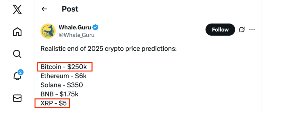 Криптовалютный аналитик Кит.Гуру считает, что если Биткойн вырастет до $250 000, XRP может достичь $5 к концу 2025 года. Это более чем в два раза больше, чем сейчас 2,47 доллара США.