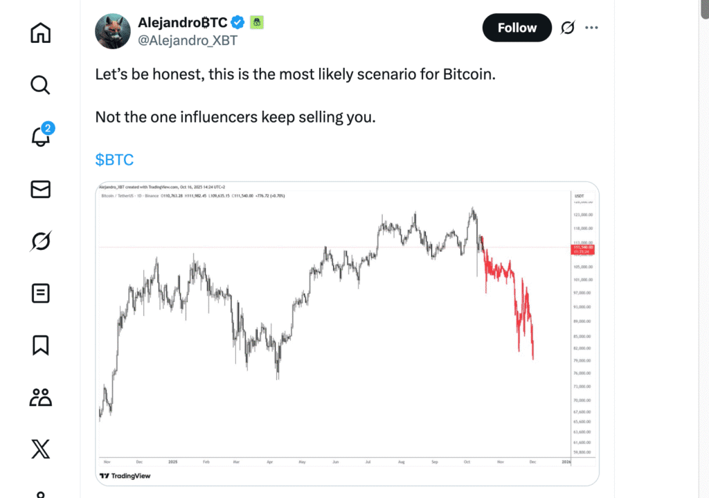 Он считает, что Биткойн может упасть так низко, как 79 000 долларов в течение следующих трех месяцев. Указывает на циклы исторической коррекции, это последовало за предыдущими пиками бычьего рынка. «Биткойн всегда месяцами остывает, прежде чем снова подняться», — объяснил Алехандро.