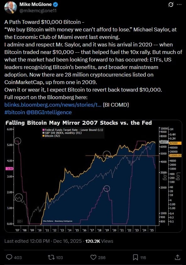Макглоун прогнозирует, что при крайне неблагоприятных условиях цена Биткойна упадет до 10 000. долларов. По оценкам аналитика, это может стать своего рода перезагрузкой для Биткойна. В начале декабря МакГлоун предупредил о падении BTC до 50 000. долларов.