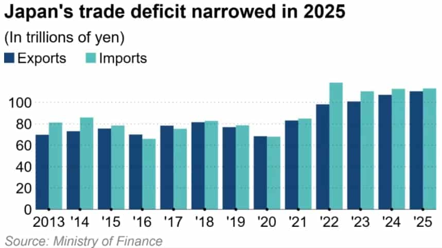 Несмотря на снижение экспорта в США, общий объем экспорта Японии в 2025 году вырос на 3,1% до 110,4 трлн иен, главным образом за счет поставок полупроводников и электронных компонентов в Азию. Импорт рос медленнее, что помогло сократить торговый дефицит более чем наполовину, до 2,6 триллионов иен, сохранив тенденцию дефицита в течение пяти лет. Частично более высокие экспортные показатели были обусловлены ускорением поставок в преддверии повышения тарифов США и ослабления иены.
