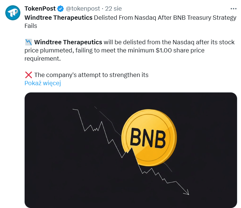 Предполагалось, что это был прорыв и выход из неприятностей, и в конечном итоге он закончился быстрой драмой. Windtree Therapeutics, американская биотехнологическая компания, которая всего лишь месяц назад объявила о входе в казначейственную стратегию на основе Binance Coin (BNB), только что получила красную карту от Nasdaq. Ее действия перестанут записаться на танцполе.