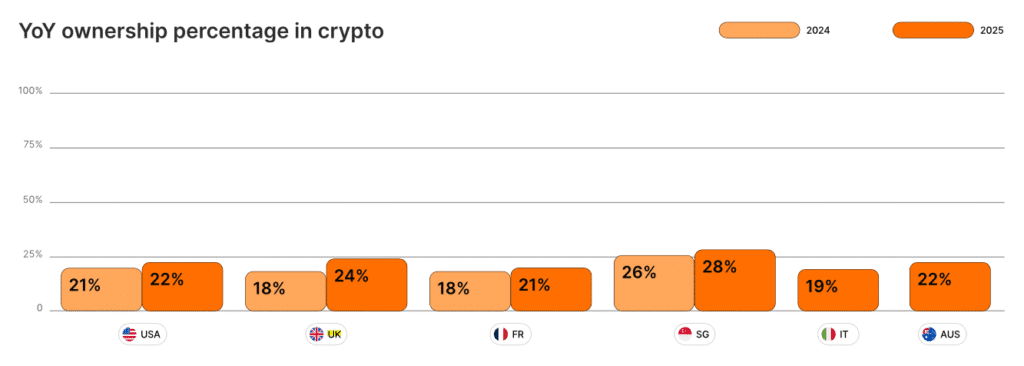 Но Корея является лишь частью более широкой тенденции. Согласно отчету Близнецов, в 2025 году именно Великобритания записала самое быстрое увеличение участия пользователей криптовалюты. По крайней мере, в списке проверенных стран. Процент британцев с криптографией увеличился с 18% год назад до 24%. Это значительное изменение, тем более что у Великобритании все еще нет готовой регуляторной структуры.