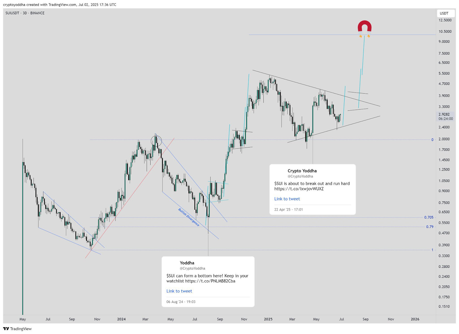 Между тем, анализы показывают, что SUI может иметь еще больший потенциал роста цен. В частности, эксперт по рынку в недавнем посте в Твиттере подчеркнул, что рост SUI до 10 долларов США неизбежно. Он сослался на возможный отрыв от симметричного треугольника в трехдневном интервале.