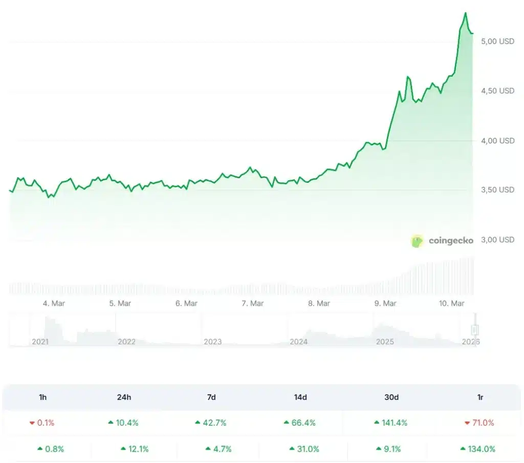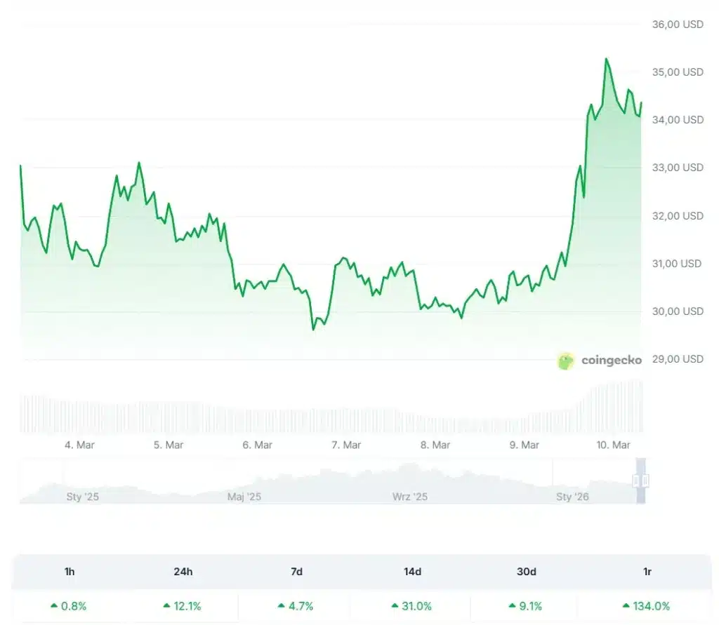 Сильное начало недели обусловлено главным образом резким увеличением объемов торговли товарами на децентрализованной бирже Hyperliquid в ответ на обострение конфликта на Ближнем Востоке. Важен был и прогноз, представленный Артуром Хейсом. Бывший генеральный директор биржи BitMEX подсчитал, что к августу 2026 года цена токена достигнет $150.