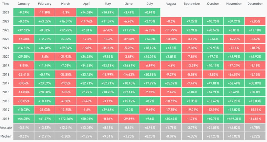 Июнь закончился в записи — Биткойн достиг самого высокого ежемесячного закрытия в истории. Обменной курс превысил 107 000 долл. США, что многие инвесторы считали сигналом силы. Июль, оглядываясь назад, также часто приносил увеличение. Более того, американский индекс S & P 500 никогда не зафиксировал убытки в этом месяце. Так будет ли история повторяться снова?