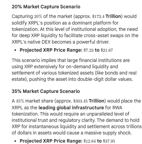 Между тем, мы используем Google Gemini для оценки потенциальной цены XRP, если XRPL выиграл 20% или 35% от прогнозируемого рынка RWA на сумму 867 триллионов долларов. Бот добавил, что цена XRP будет зависеть от того, насколько глубоко токен будет интегрирован как мостовые активы и источник ликвидности для децентрализованного (DEX) XRPL.