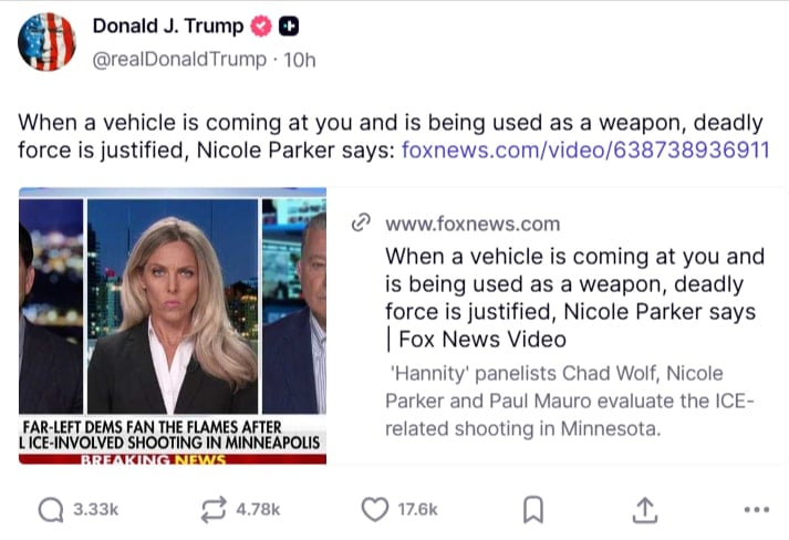 Президент Дональд Трамп в настоящее время находится в Вашингтоне, округ Колумбия, и следит за ситуацией.. В своем заявлении в социальных сетях он явно встал на сторону офицера. Он также заявил, что государство должно защищать офицеров от нападений, и обвинил в произошедшем его. «радикальный левый».