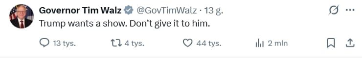 В свою очередь губернатор Миннесоты Тим Уолц назвал послания, исходящие из Вашингтона, пропагандой.