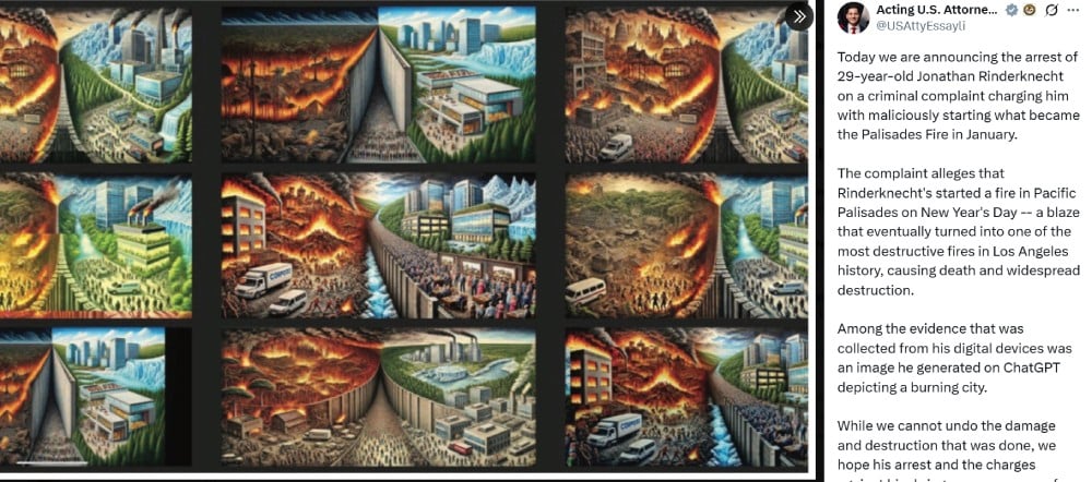 Искусственный интеллект уже много месяцев сопровождает нас в повседневной жизни. Кто-то использует это профессионально, кто-то для развлечения, но, похоже, у нас есть прецедент, когда дело касается уголовных дел. Джонатан Риндеркнехт, 29 лет, был арестован после того, как следователи обнаружили на его телефоне изображение, созданное ChatGPT. Не какой-нибудь, потому что там изображен… горящий город. Оказалось, что это не совпадение. Будет ли история разговоров с ботом OpenAI принята во внимание как реальное доказательство в столь серьёзном деле?