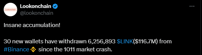 Согласно онлайн-анализу Lookonchain, после краха 11 октября произошло «невероятное накопление». Тридцать новых кошельков сняли с Binance ошеломляющие 6,26 миллиона LINK (стоимостью 116,7 миллиона долларов). Spot On Chain также подтвердил это, указав на одного конкретного кита («0xbBF»), который накопил 1,34 миллиона ССЫЛОК всего за два дня. Эта модель часто сигнализирует о намерении провести долгосрочное обслуживание.