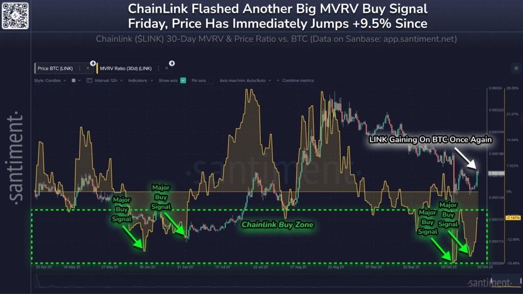 Оптимистическую картину ситуации вносит аналитическая компания Santiment. Сообщалось, что 30-дневная MVRV LINK упала ниже нуля во время крушения. Исторически сложилось так, что когда это соотношение падает ниже -5%, это было надежным сигналом «покупать снизу» для LINK. Это указывает на периоды, когда настроения участников чрезмерно пессимистичны.
