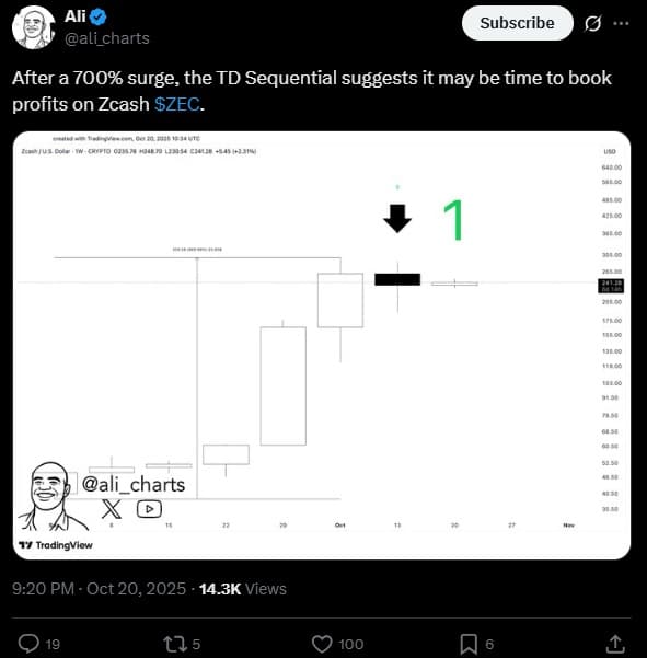 Поэтому в последние дни наблюдается небольшое замедление, и получается, что это может быть не совпадением. Али Мартинес внимательно рассмотрел графики ZEC. Уважаемый аналитик криптовалютного рынка не сомневается. Один из его последних постов на X звучит как предупреждение. Мартинес предупреждает, что после роста на 700% индикатор TD Sequential говорит о том, что пришло время зафиксировать прибыль от Zcash.