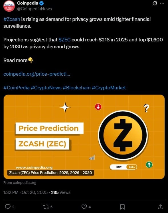 Между тем, по оценкам Coinpedia, Zcash может продолжать расти, поскольку все больше пользователей стремятся к конфиденциальности на фоне усиления финансового надзора. Портал сообщает, что к концу года курс альткоина может упасть до $218.. Однако в долгосрочной перспективе, а именно к 2030 году, ZEC может достичь $1600.