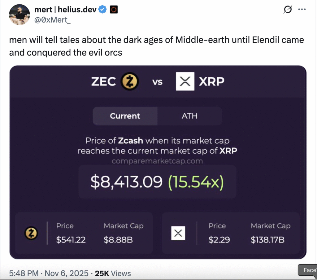 Сравнение быстро распространилось на платформу X после прихода разработчика Мерта из Helius. Эксперт поделился этим с шутливой подписью о «темных веках Средиземья». Тема конфиденциальной монеты также стала темой разговоров на протяжении всего вечера.