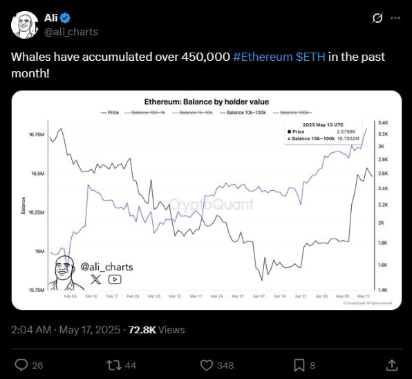 Есть некоторые предпосылки, которые позволяют нам думать, что жетон снова завоевытся и еще не сказал последнее слово. Как сообщил Али Мартинес, в последние недели токен был высоким по желанию крупнейших игроков. В одном из последних постов для X популярный эксперт сказал, что в прошлом месяце киты вытащили более 450 000 с рынка. кусочки эт. Это четкий сигнал, что толстая рыба все еще видит шансы получить эту криптовалюту.