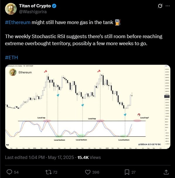 Подобное убеждение разделяется Титан Крипто, который заметил, что стохастический показатель RSI предполагает, что токен все еще имеет место для роста, прежде чем он достигнет «крайней территории». Следовательно, аналитик оценивает, что »Ethereum может иметь еще больше топлива в баке. «
