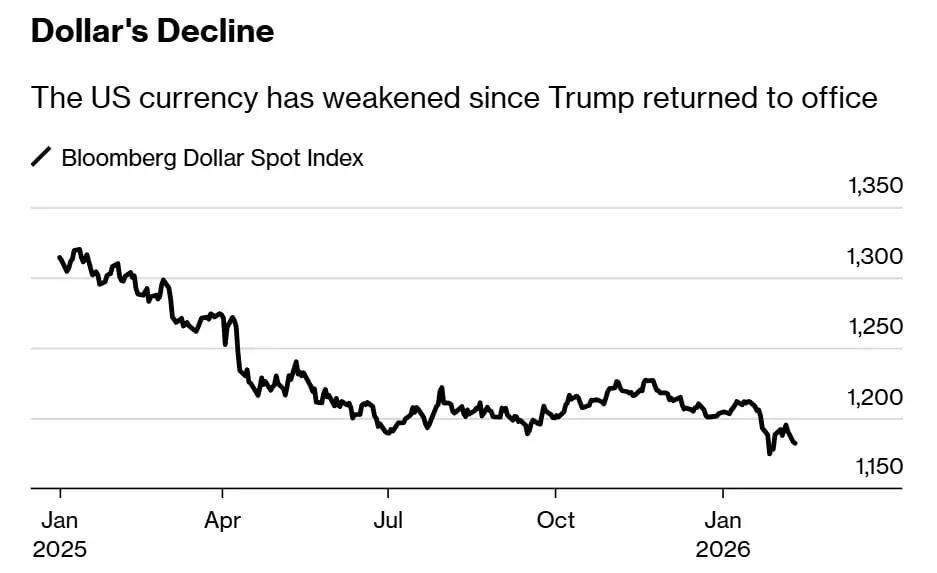 Доллар ослаб по отношению к широкой корзине валют примерно на 9% ежегодно. В январе он достиг самого низкого уровня с марта 2022 года. Это значительный шаг, как с точки зрения масштаба, так и с точки зрения устойчивости. Важно отметить, что понижательное давление не прекращается, и рынок все больше игнорирует сценарий сохранения более слабой валюты в среднесрочной перспективе.