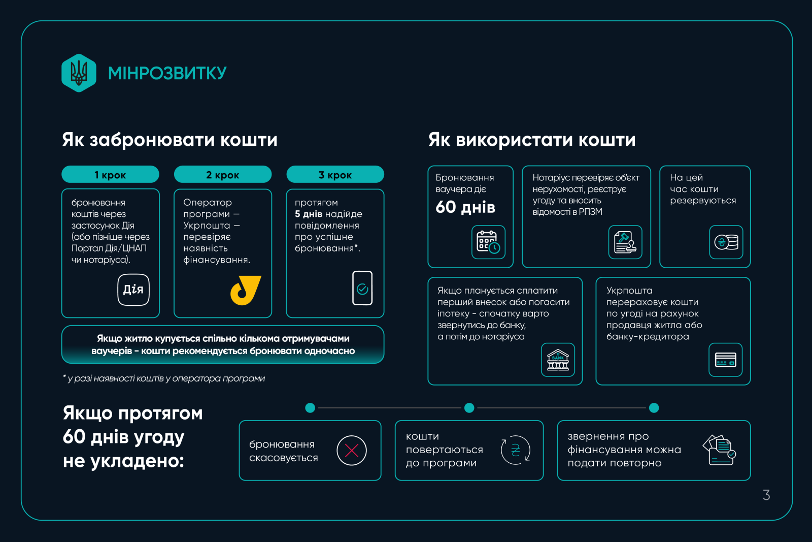 Если планируете уплатить первый взнос или погасить ипотеку, сначала обратитесь в банк, а затем в нотариус. Банк должен согласовать кредит и возможность использования ваучера как источника оплаты, поскольку средства будут поступать не от заемщика, а от государства через Укрпочту.