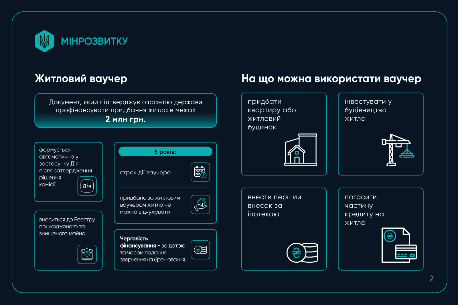 В рамках программы есть Восстановление ВПЛ, выехавших из ТОТ и имеющих статус участника боевых действий или лица с инвалидностью в результате войны, могут получить жилищный ваучер на сумму 2 млн грн на приобретение собственного жилья. Об этом говорится в сообщении Минразвития общин.