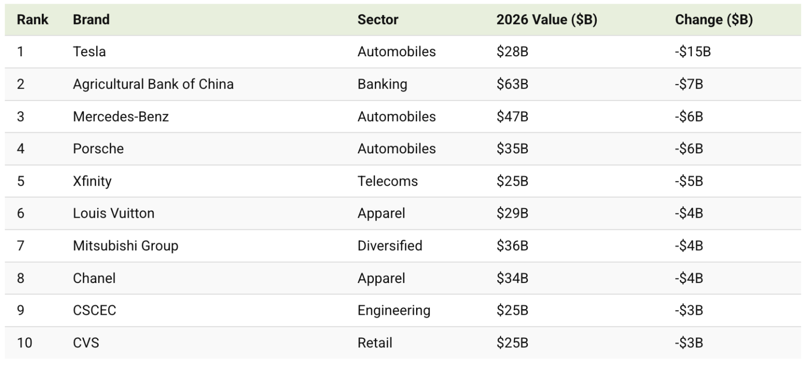 Абсолютным антилидером года стала компания Tesla. Ее стоимость как бренда сократилась на ошеломляющие $15 млрд всего за один год. Если в 2025 году бренд оценивали в $43 млрд, то в 2026 этот показатель упал до $28 млрд.