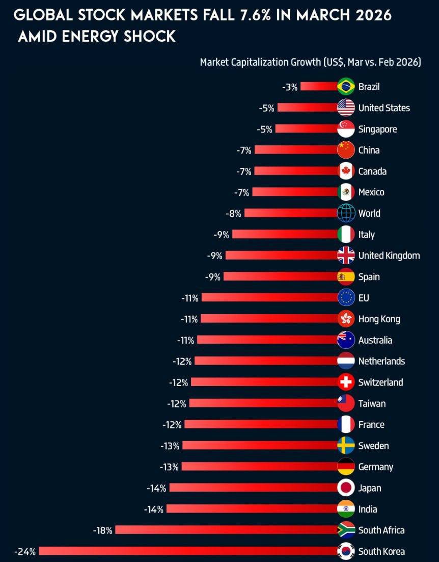 Европейский центральный банк (ЕЦБ) открыто заявил, что энергетический кризис ломает планы по обузданию инфляции, из-за чего регулятор отложил понижение процентных ставок. Аналитики инвестиционного банка JP Morgan оценивают базовый риск наступления глобальной рецессии (падения экономики) в 35%. Особенно уязвимыми оказались именно рынки Азии (Япония, Южная Корея, Индия), поскольку на них приходится 75% нефти и 59% СПГ, экспортируемых из заблокированного Персидского залива, что объясняет их статус аутсайдеров в рейтинге капитализации.