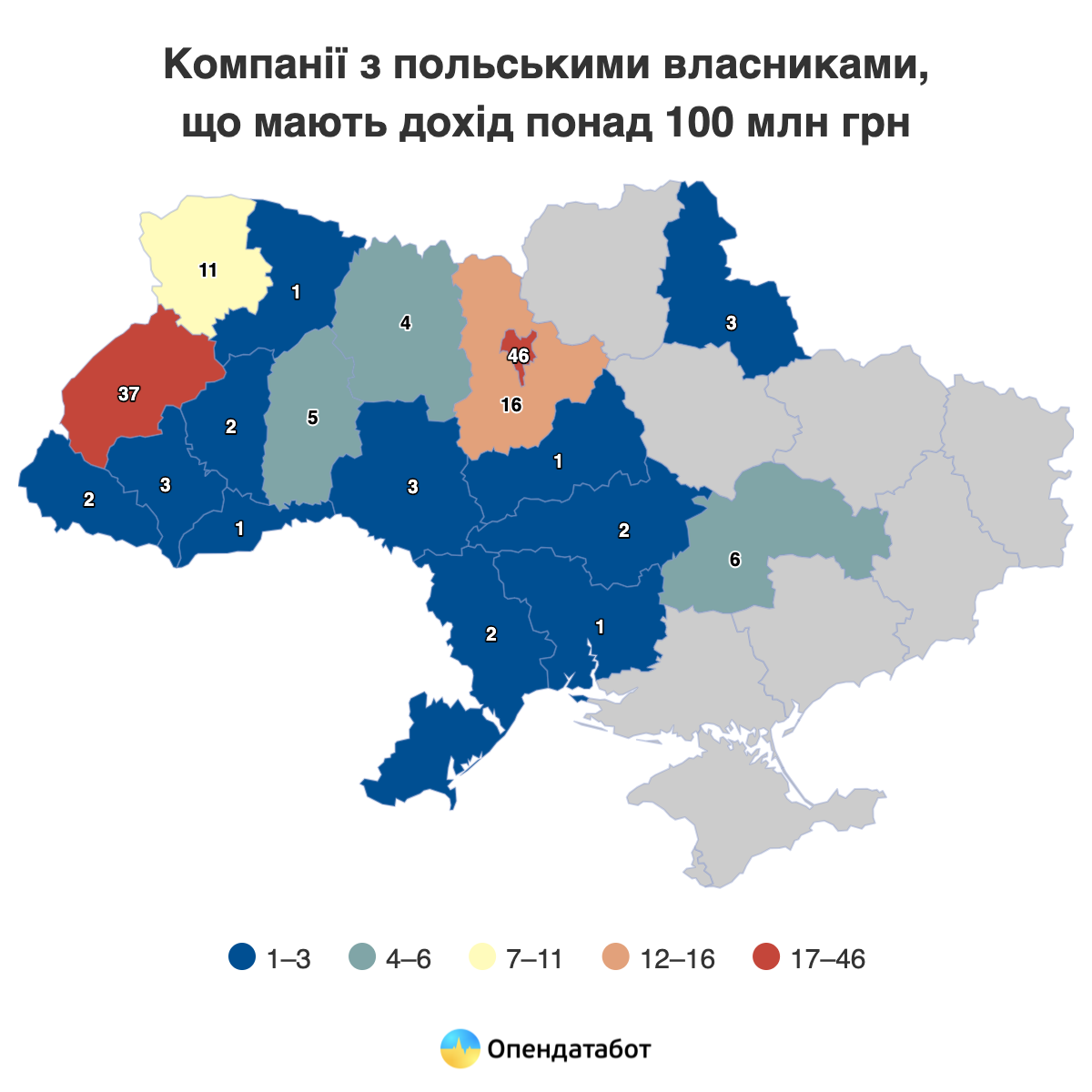 Около трети бизнесов с польскими владельцами и доходом 100+ млн грн зарегистрированы в Киеве — 46 компаний, еще 16 — в Киевской области. Следует Львовщина — 37 компаний, далее Волынь (11) и Днепропетровщина (6).