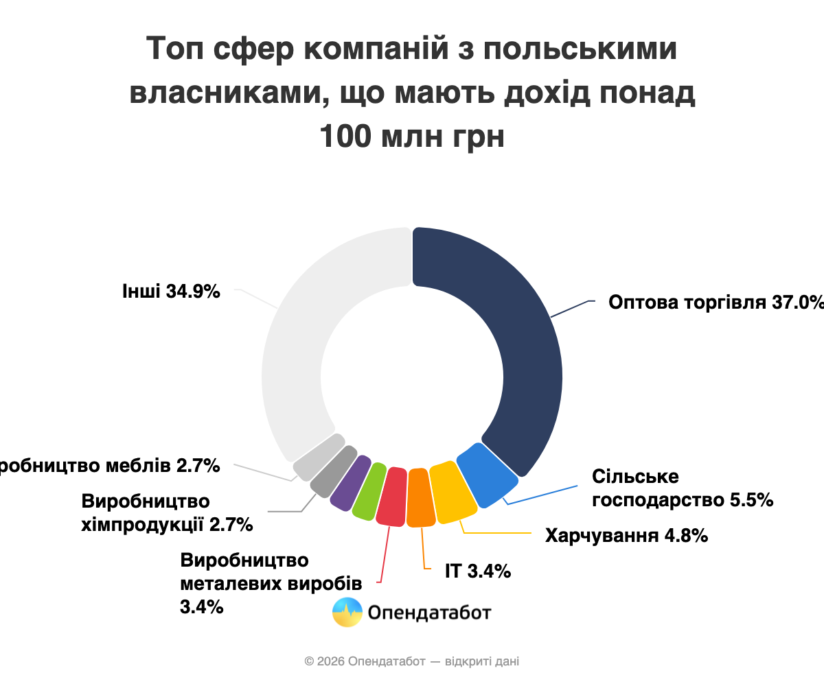 Более 1,1 тысячи компаний с польскими владельцами, подавших финансовую отчетность, зарегистрированы в Украине по данным Единого государственного реестра. 123,01 млрд грн составил доход крупнейших польских компаний в Украине в 2025 году. Это на 20% больше, чем в 2024 году. В то же время, каждая восьмая такая компания получает доход более 100 млн грн. Лидером стала компания ЛПП Украина, управляющая брендами одежды Reserved, Cropp, House, Mohito и Sinsay, пишет Опендатабот.