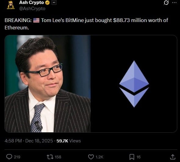 Один из них — Том Ли, который постепенно становится такой же важной фигурой для Эфириума, как Майкл Сэйлор для Биткойна. На этой неделе BitMine Immersion Technologies, компания известного стратега, снова купила эту криптовалюту.