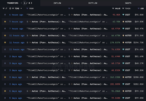 Lookonchain подчеркнул, что кит ThisWillMakeYouLoveAgan сходит с ума от покупок в ASTER. Стоит отметить, что этот портфель имеет историю значительного роста: он заработал более 36 миллионов долларов США от предыдущей покупки PEPE.