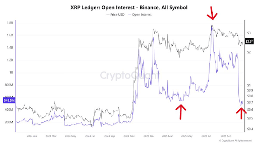 Данные CryptoQuant показывают, что открытый интерес к XRP на бирже Binance упал ниже 500 миллионов долларов, самого низкого уровня с апреля. Аналитики рассматривают это снижение как потенциальную отправную точку для восстановления, поскольку рынок избавляется от избыточного кредитного плеча. Когда эта тенденция наблюдалась в последний раз, стоимость XRP выросла почти вдвое за считанные недели.