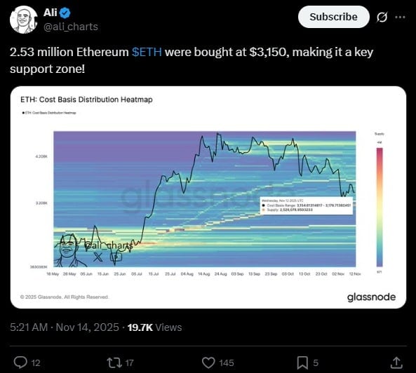 Али Мартинес в одном из своих последних постов на X рассказал, что киты купили 2,53 миллиона штук Ethereum, когда цена токена упала до 3150 долларов США за монету.. По оценкам эксперта, это может стать ключевым уровнем поддержки криптовалюты. Данные, которые распространил Мартинес, были собраны известной аналитической платформой Glassnode.