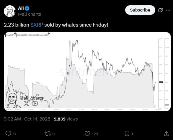Если посмотреть на активность китов сразу после обвала выходных, то особенно обращает на себя внимание ситуация вокруг Ripple. Как сообщил Али Мартинес в одной из последних записей на X, с пятницы киты продали целых 2,23 миллиарда штук XRP. Данные, распространенные экспертом, взяты с известной аналитической платформы «Сантимнет».