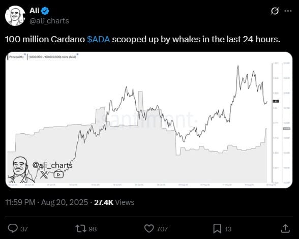 Согласно данным известной аналитической платформы Santiment, до 100 миллионов кардано поглощалось с рынка всего за 24 часа. Эти данные распространялись на его X, включая Али Мартинес, ценного эксперта по криптовалюте.