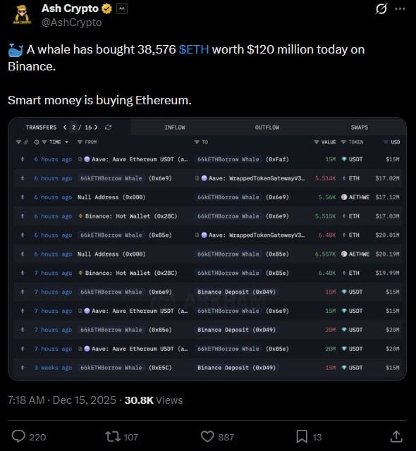 Некоторые киты просто покупают и приумножают свои ресурсы. Ash Crypto сообщила о крупной сделке несколько часов назад. Популярный эксперт опубликовал данные о сделке, в ходе которой один кит самостоятельно приобрел более 38 000 штук. кусочки ETH. На покупку токена кит потратил 120 миллионов долларов.