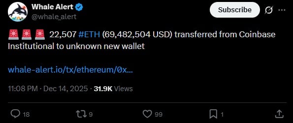 С другой стороны, спад заставил некоторых китов начать переводить свои монеты с бирж на частные кошельки. О таких случаях сообщает, в частности, Whale Alert. Платформа, отслеживающая активность крупнейших держателей рынка, выследила кита, который перевел 22 507 ETH на сумму примерно $69,5 млн с Coinbase на неизвестный кошелек.