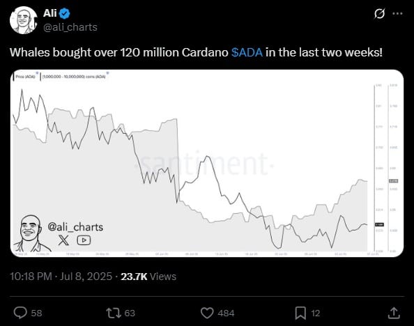 Кардано был высоким в списке пожеланий в последние недели. Положительная информация для владельцев токенов была предоставлена Али Мартинесом. По его словам, популярный эксперт по криптовалюте в одной из последних записей на Portal X что за последние две недели киты купили более 120 миллионов ADAПолем Данные, представленные Мартинесом, поступают из известной аналитической платформы Santiment.
